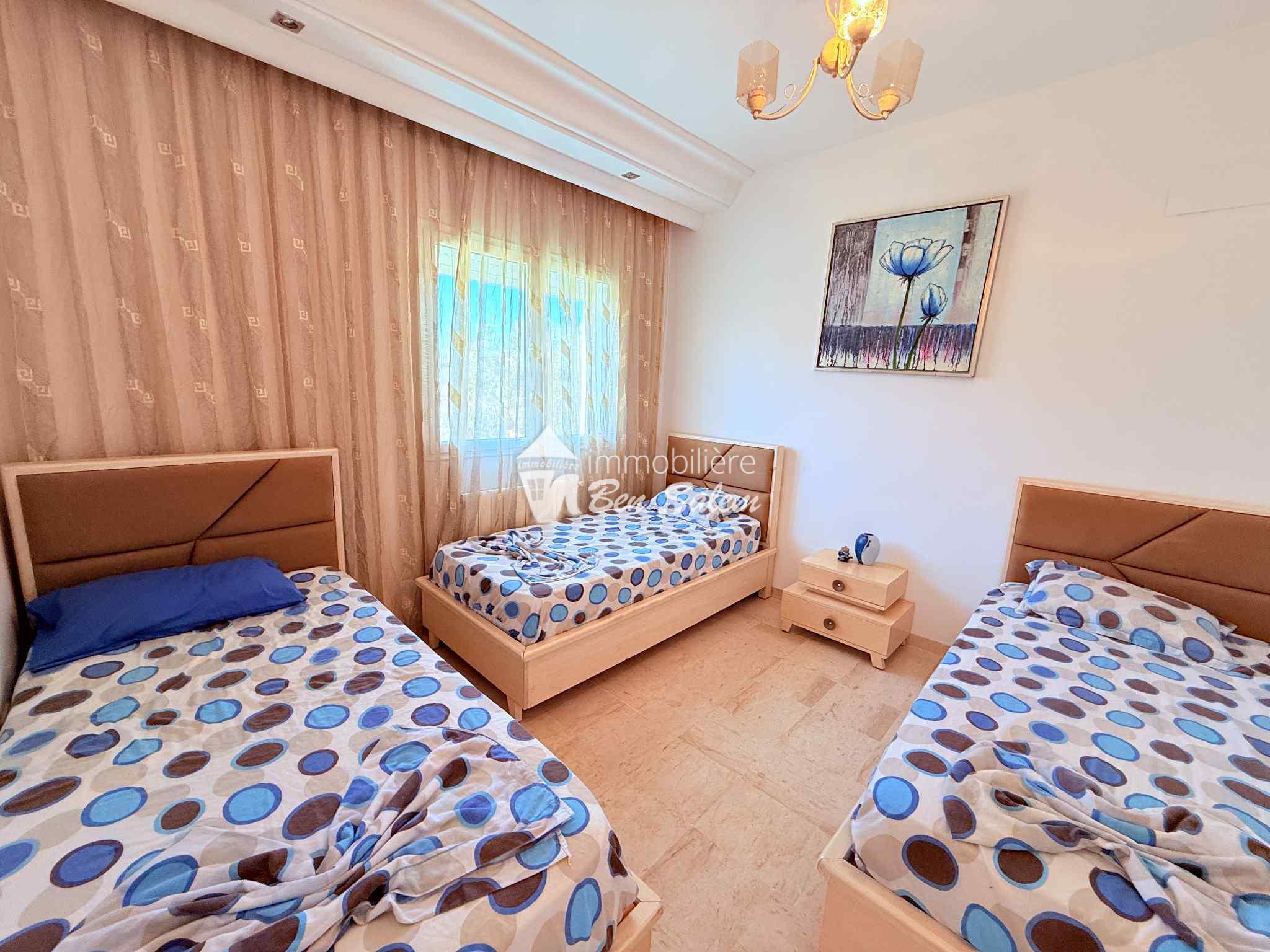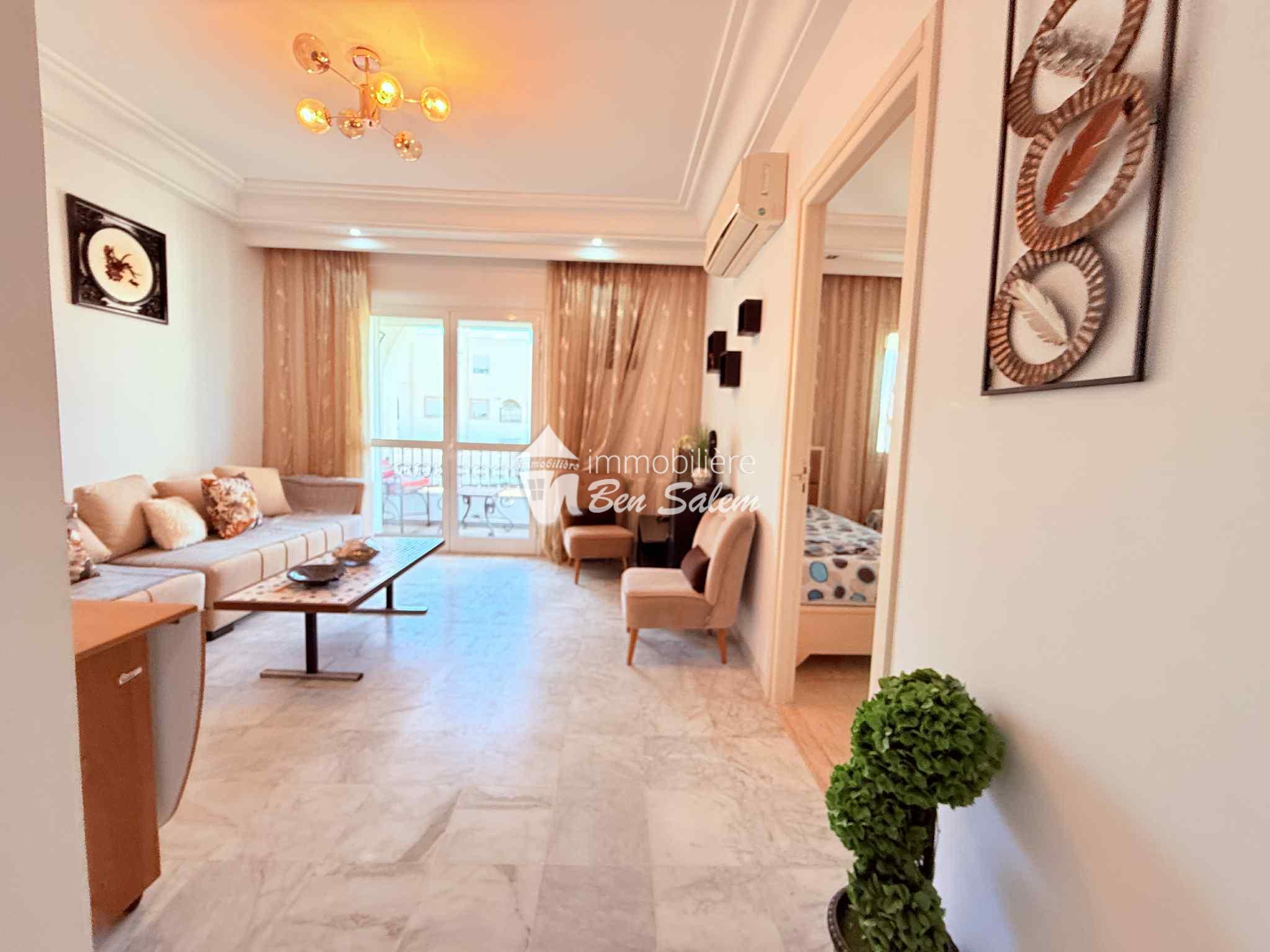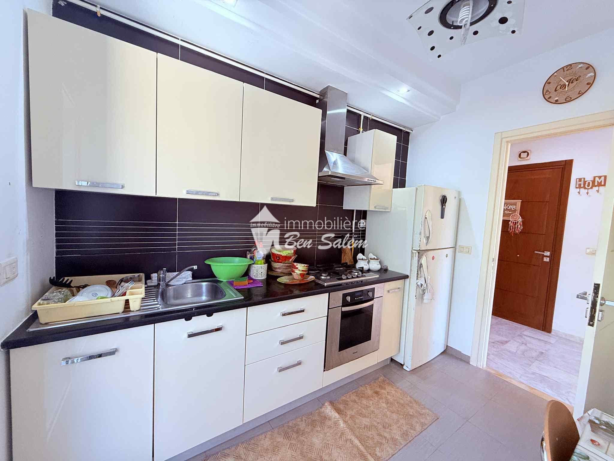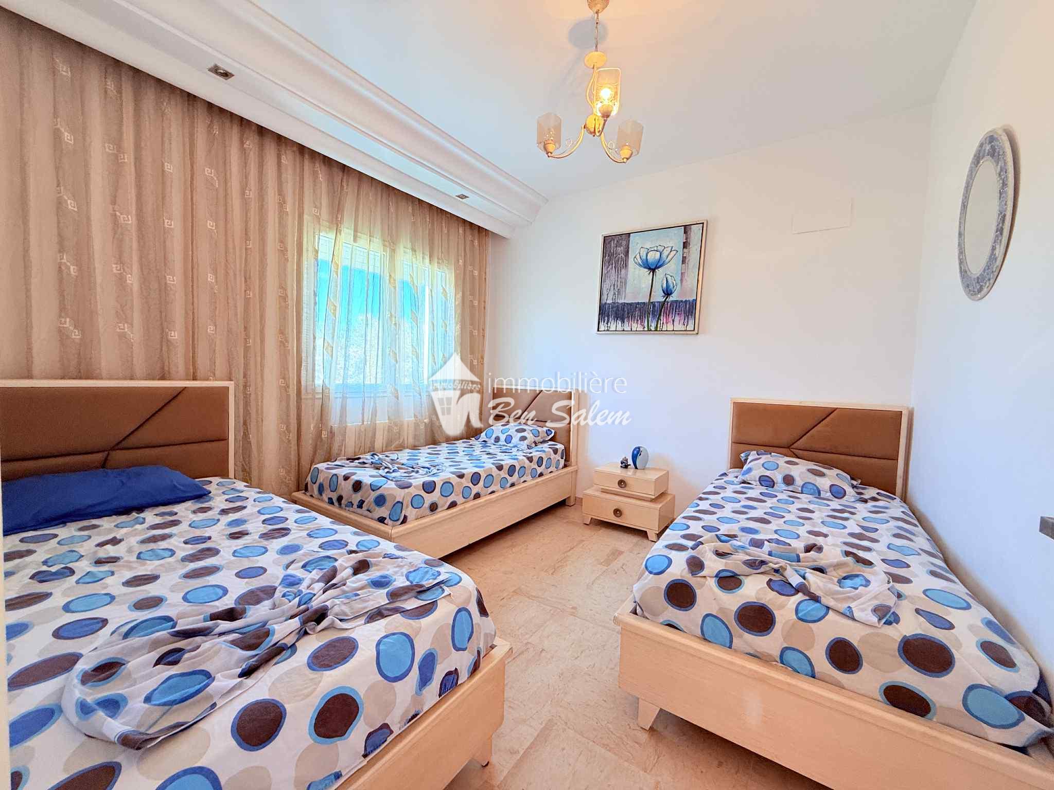 A vendre, un bel appartement situé au 2 ème étage d’une résidence paisible et surveillée au cœur de la zone touristique Hammamet Nord proche de tous commerces (hôtels (Hôtel El Fell, Nahrawess..), restaurants, bars, plages (300 m), club, aquaparc, commerces).