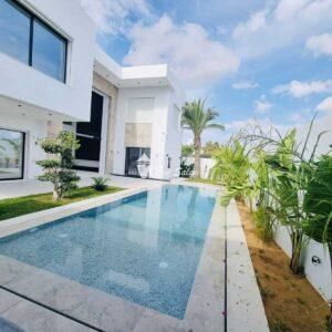 A vendre, une villa luxe et moderne de haut standing avec piscine et jardin gazonné, située à Hammamet sud à 5 min de jinene hammamet dans un quartier résidentiel